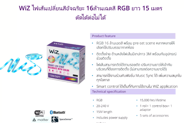 WIZ ไฟเส้นเปลี่ยนสีอัจฉริยะ 16 ล้านเฉดสี ความยาว 15 เมตร ติดตั้งง่าย พร้อมอุปกรณ์การติดตั้ง