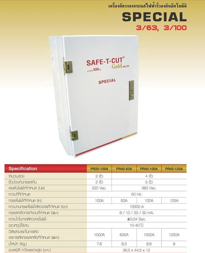 เครื่องตัดไฟ เซฟทีคัท รุ่น special 3P เป็นเครื่องตัดไฟรั่วลงดิน เพื่อป้องกันไฟจะตัดกระแสไฟฟ้าทันที เมื่อเกิดไฟฟ้าดูด ไฟฟ้ารั่ว ไฟฟ้าเกิน
